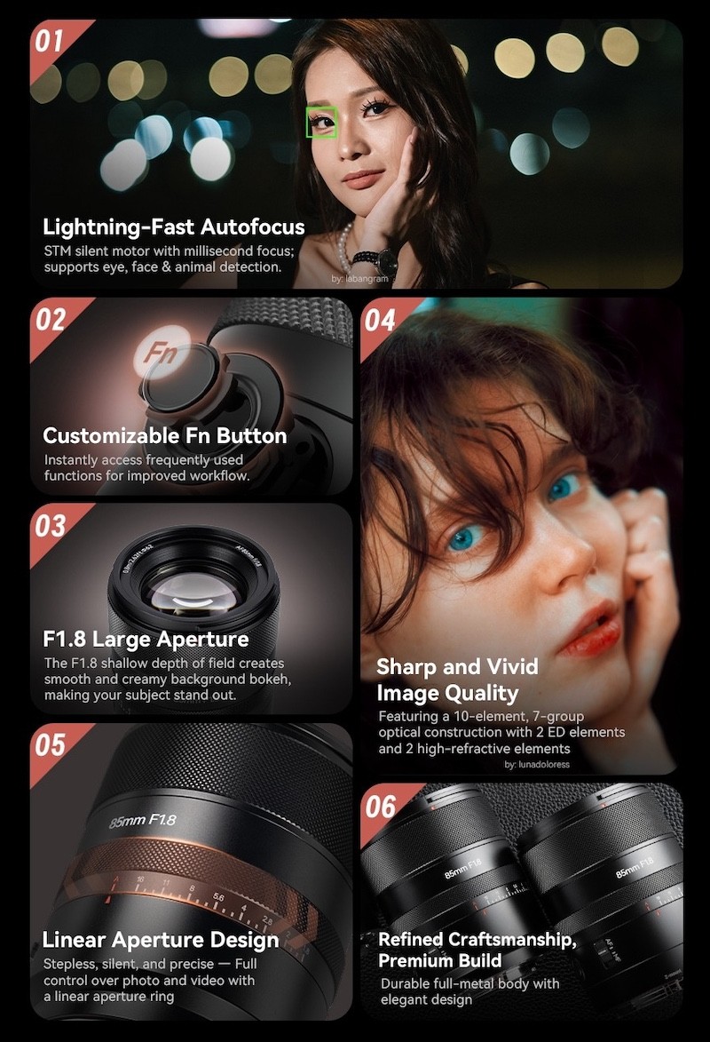 近日,岩石星AstrHori AF 85mm f/1.8 Mark II 全幅镜头发布,支持E/L/Z 卡口。这支镜头为7组10片光学结构,镜重仅441克,非常轻便,光圈为F1.8,拍摄人像的背景虚化效果非常不错。目前此镜头已经开始预订。